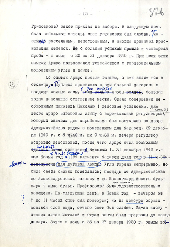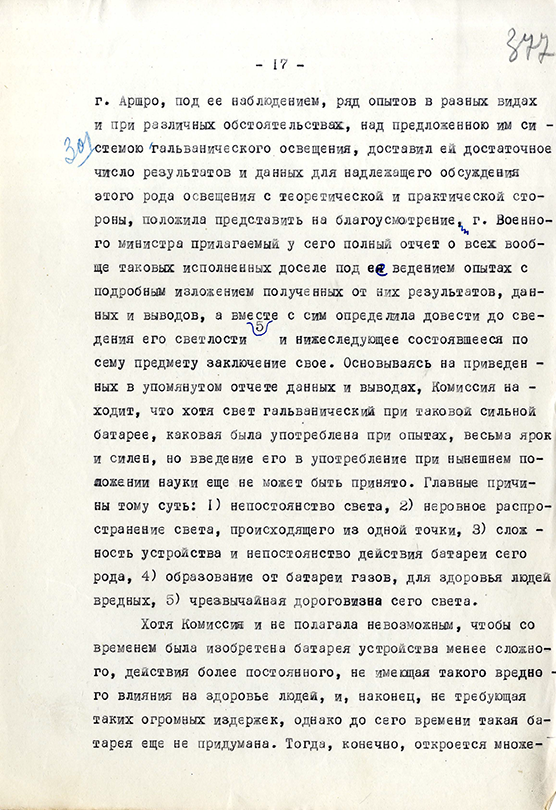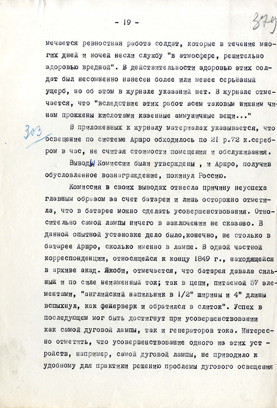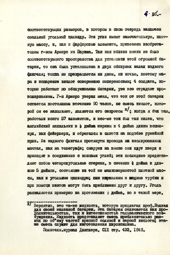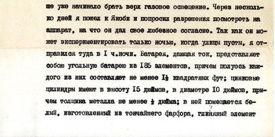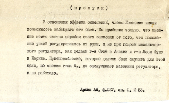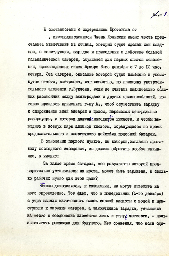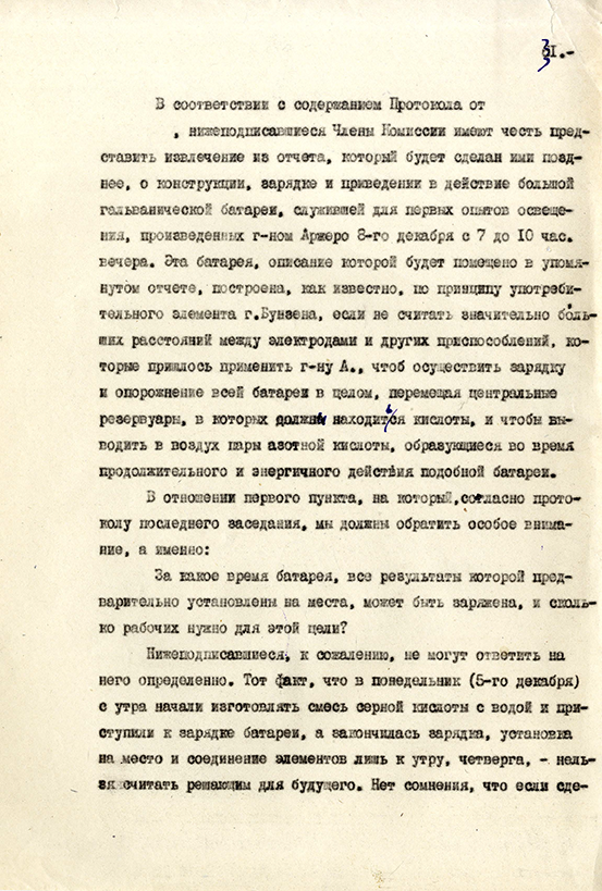 распространение света, сложность устройства, образование от батареи вредных газов и чрезвычайную дороговизну. Комиссия была закрыта,