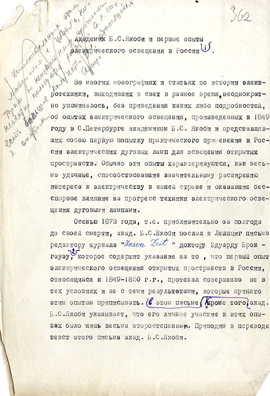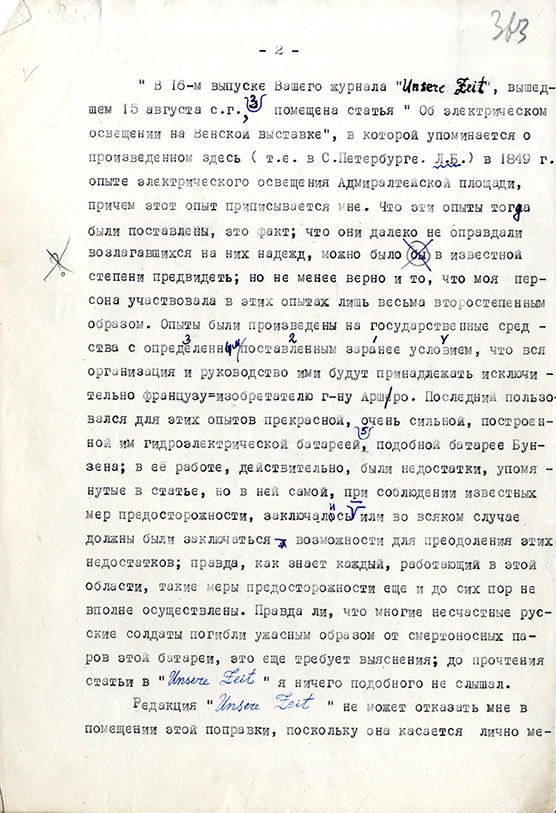(“Unsere Zeit”) в Лейпциге, Э. Брокгаузу. В письме Якоби уточняет обстоятельства проведения опытов в Петербурге и свою роль в них.